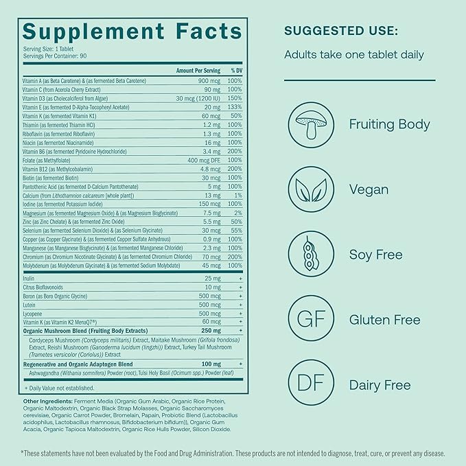True Grace One Daily Men’s Multivitamin Fermented Minerals, Organic Adaptogens & Mushrooms Whole Body Balance Immune, Endurance, Bone & Heart Support - Non-GMO, Gluten Free - 90 Vegan Tablets