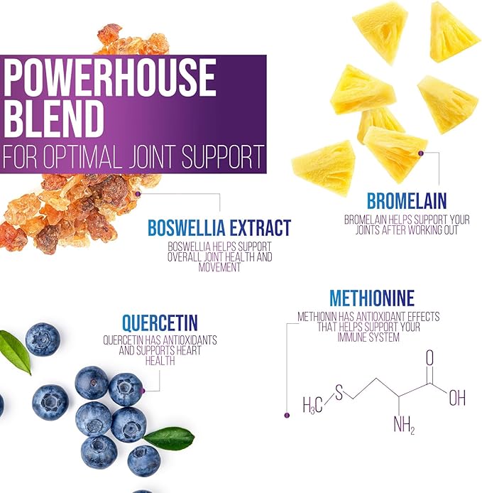 - MSM: Combined with other joint health ingredients like Turmeric, Boswellia extract, and MSM our supplement helps offer premium joint support