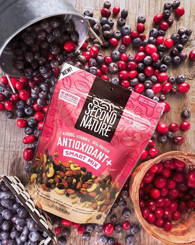 - PLANT-BASED PROTEIN SNACKS – Second Nature Antioxidant+ Smart Mix is a powerful combination of premium ingredients that is made to fuel your day, no matter where it might take you. There are (6) 10 oz resealable packages of nut snacks included.