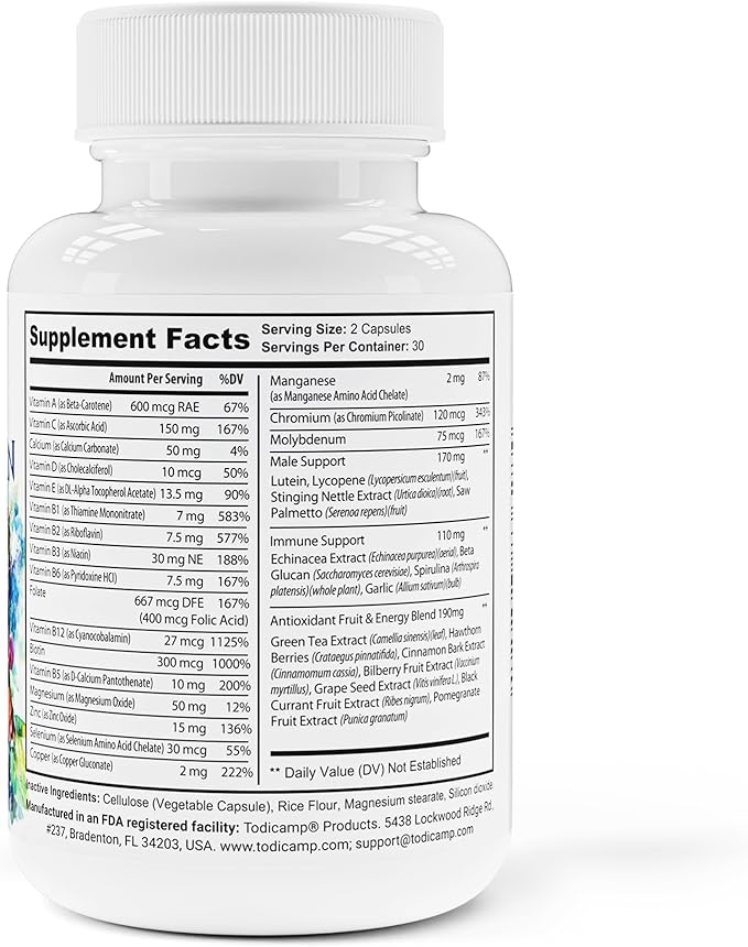 - All Key Nutrients - TODICAMP Men's vitamins include all essential nutrients to support mega men's energy, focus, drive, and overall well-being.