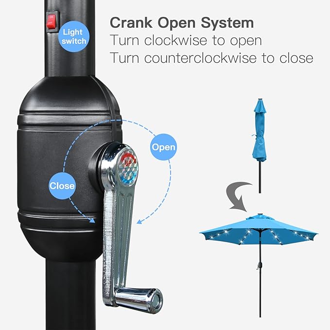- Convenient crank opens/closes system and handy push button tilt, even easy to use for kids and the elderly. Keep the sun at the back in the daytime.