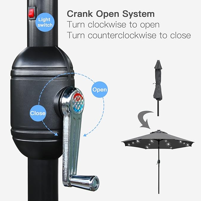 - Convenient crank opens/closes system and handy push button tilt, even easy to use for kids and the elderly. Keep the sun at the back in the daytime.