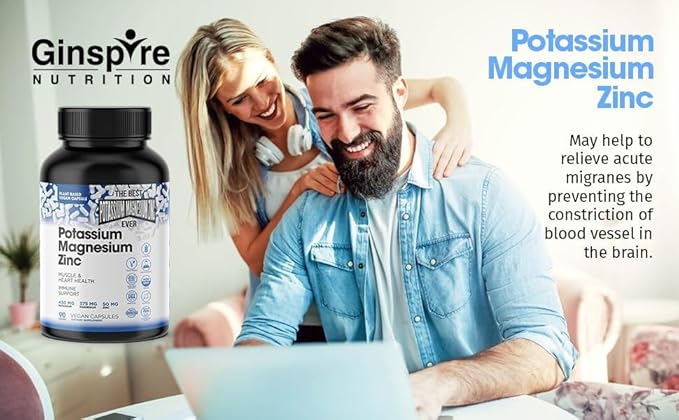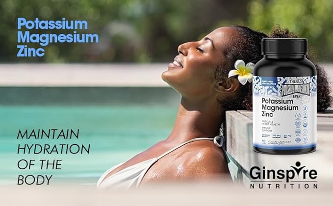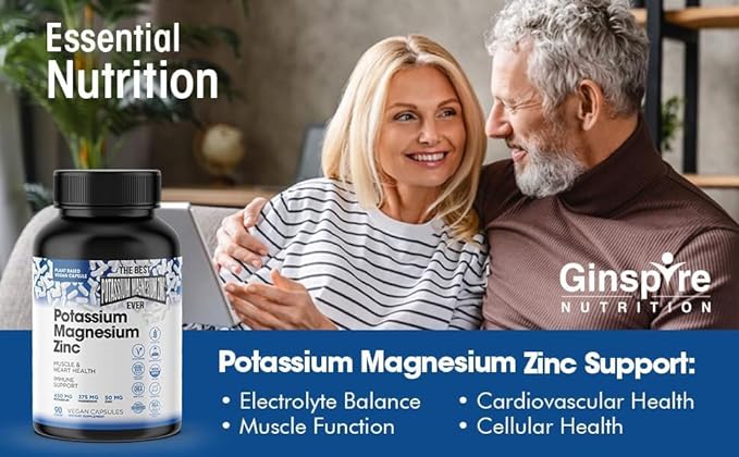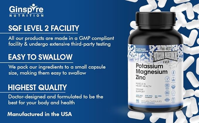 Magnesium Potassium Supplements w/Zinc - 90 Capsules - Magnesium Potassium Zinc for Vascular Health – High Absorption Vegan Potassium Magnesium Supplement for Leg Cramps & Sleep