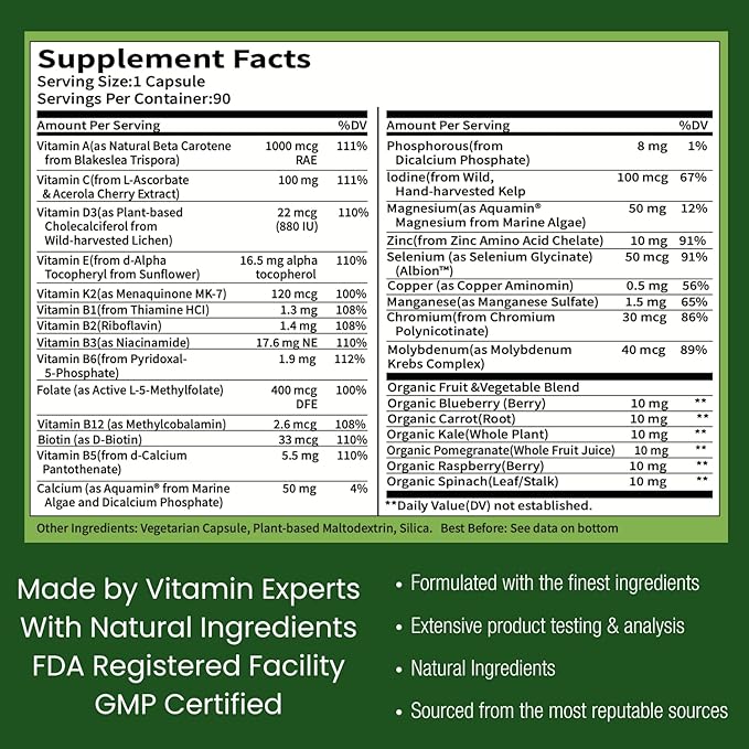 One Daily Multivitamin for Men - with Vitamins & Minerals + Organic Whole Foods, Supplement to Boost Energy, General Health - Non-GMO - 90 Capsules | 3 Month Supply