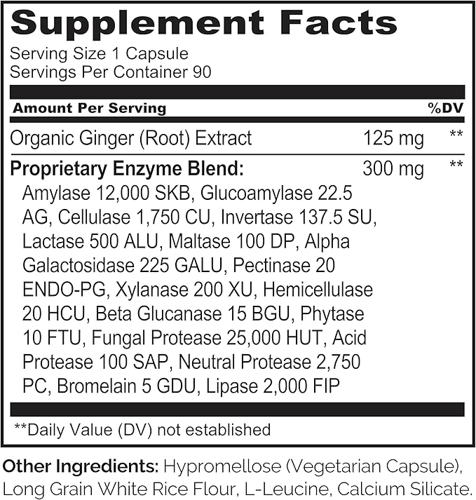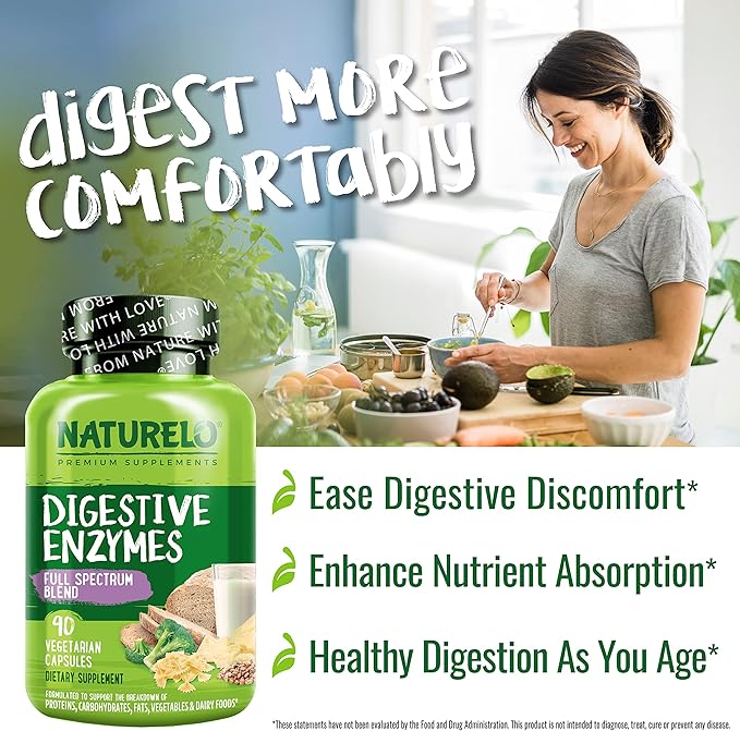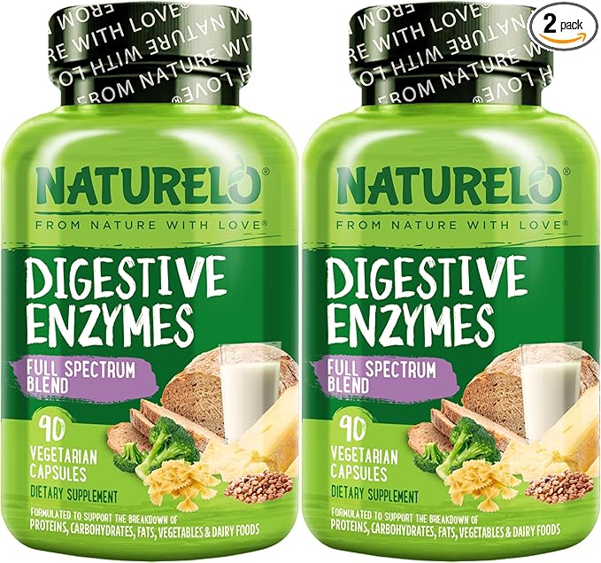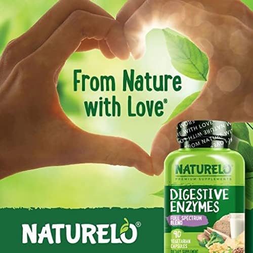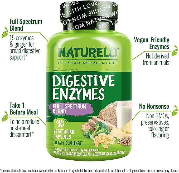 NATURELO Digestive Enzymes - Full Spectrum Support with a Broad Blend of 15 Enzymes Plus Ginger - 180 Vegan Capsules