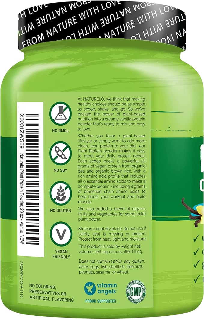NATURELO Plant Protein Powder, Vanilla, 22g Protein - Non-GMO, Vegan, No Gluten, Dairy, or Soy - No Artificial Flavors, Synthetic Coloring, Preservatives, or Additives - 20 Servings