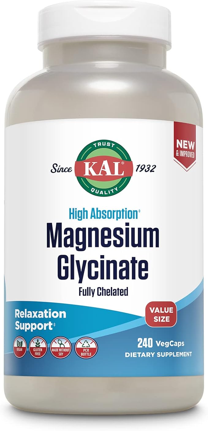 KAL Magnesium Glycinate, New & Improved Fully Chelated High Absorption Formula with BioPerine, Bisglycinate Chelate for Stress, Relaxation, Muscle & Bone Health Support, 60 Servings, 240 VegCaps