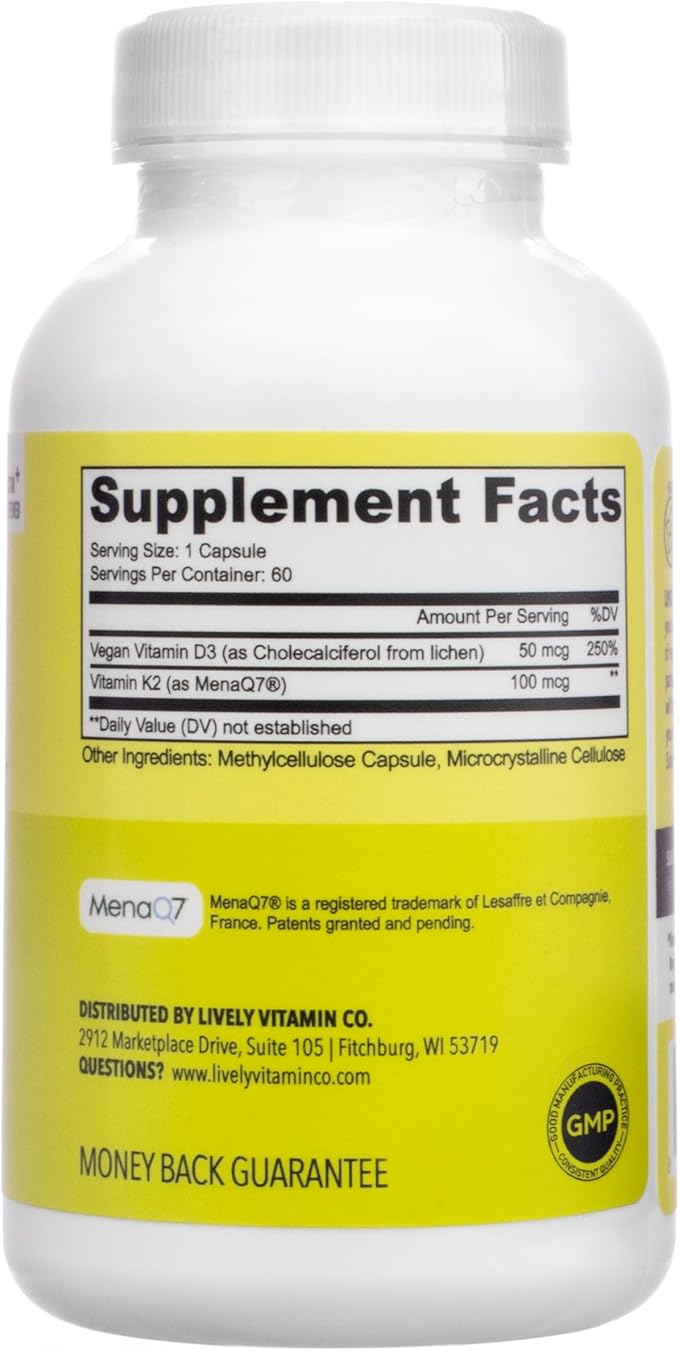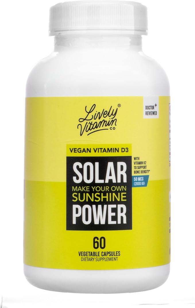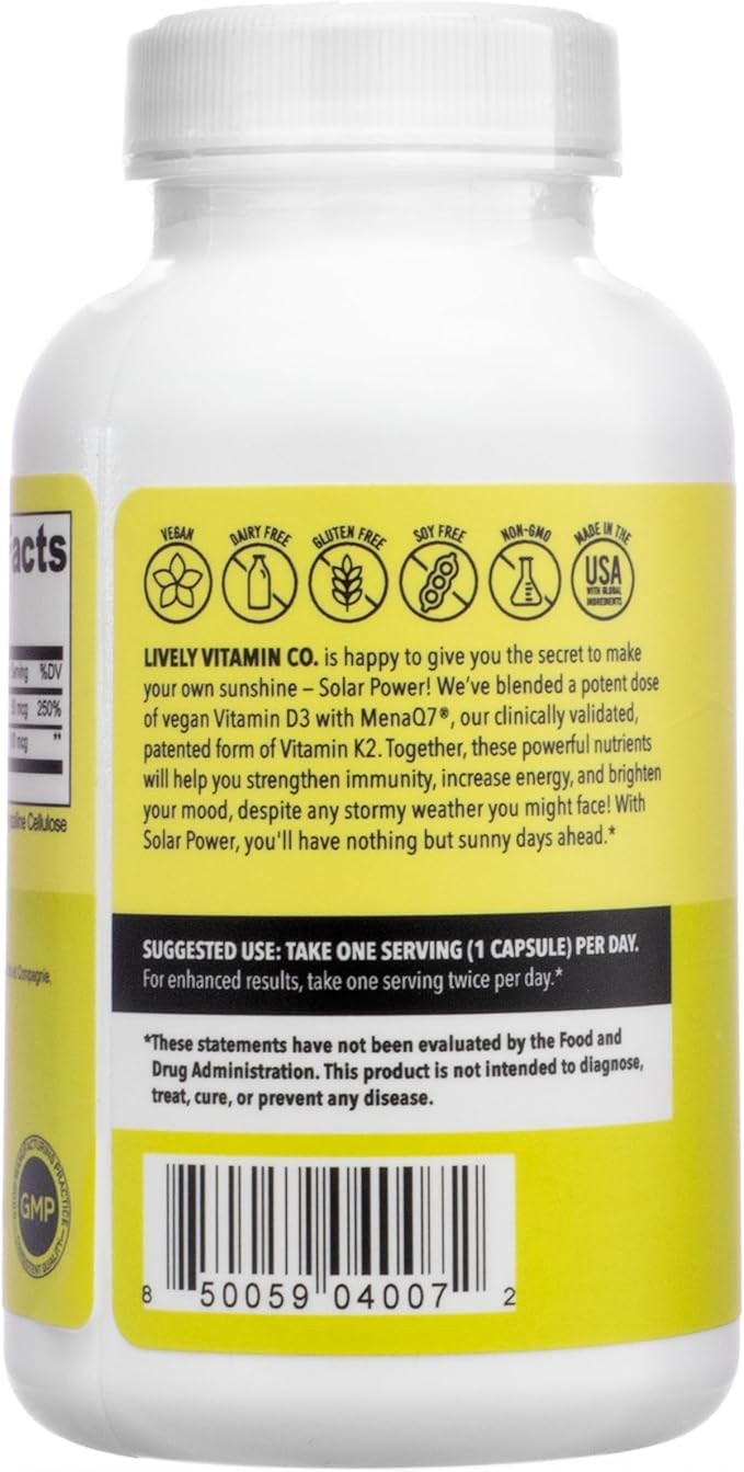 LIVELY VITAMIN CO. Solar Power Vitamin D3 2000 iu - Patented Vitamin K - MK7 - Immune Balance - Brain Function - Mood - Heart - Stress - 60 Count