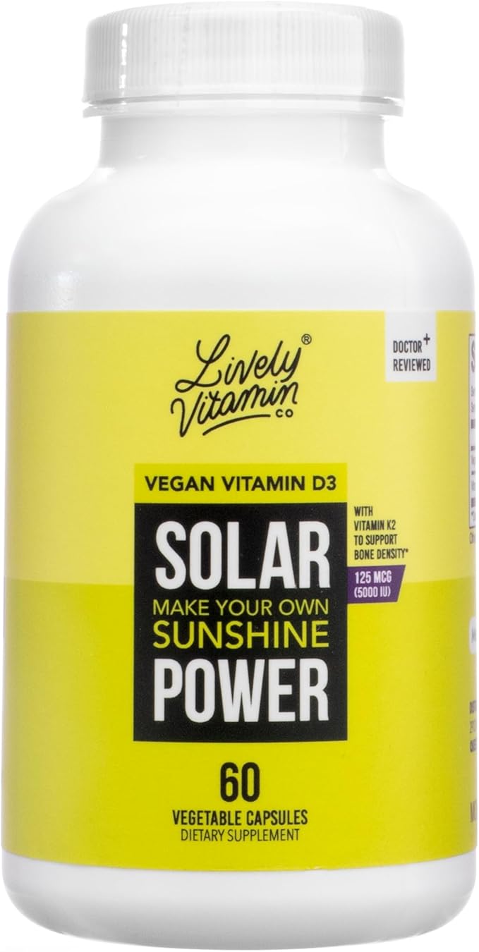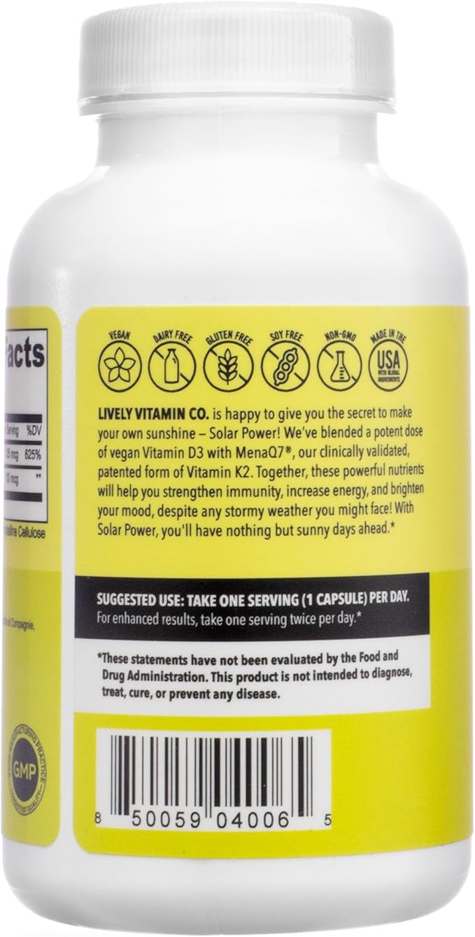LIVELY VITAMIN CO. Solar Power Vitamin D3 5000 iu - Patented Vitamin K - MK7 - Immune Balance - Brain Function - Mood - Heart - Stress - 60 Count
