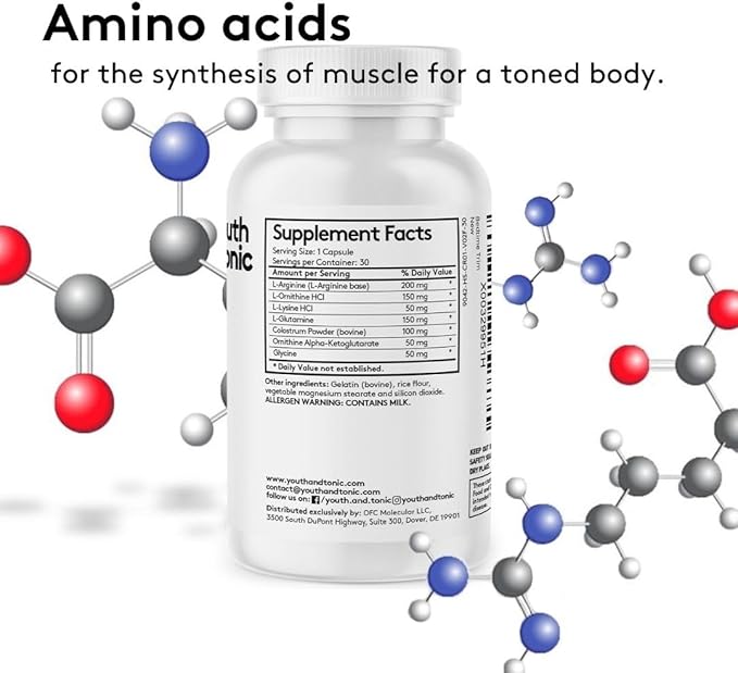 - Advanced Amino Formula ]: A tri amino complex with L-Arginine, L-Ornithine, L-Lysine to help with post-exercise recovery and assist in maintaining muscle tone for a defined body. These amino acids supplement capsules featuring L-Glutamine, Colostrum Powder, Ornithine Alpha-Ketoglutarate, L-Glycine support your body's natural metabolic functions during the night