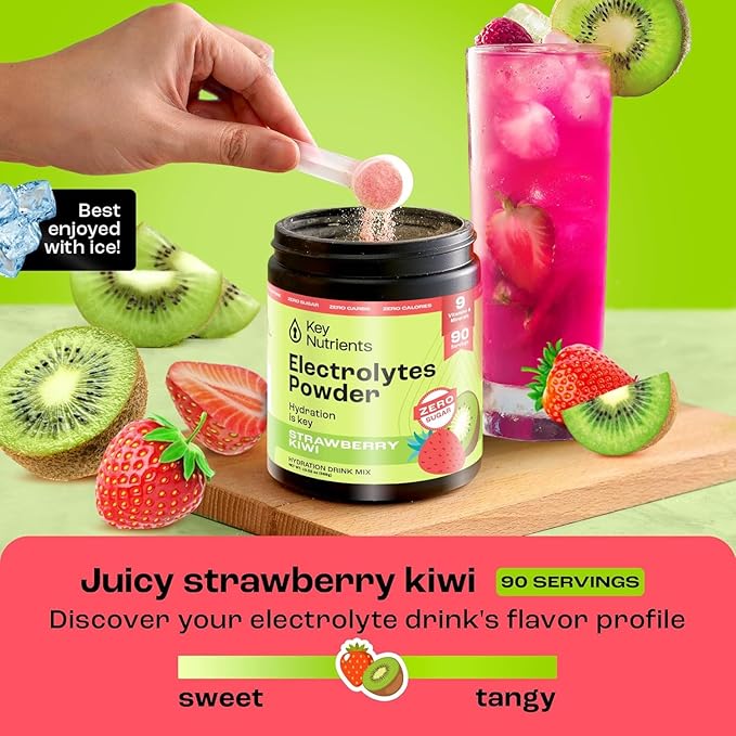 - Juicy Strawberry Kiwi - Staying hydrated goes beyond just drinking water, and a delicious strawberry kiwi electrolyte powder drink is the key. Free of calories, carbs, and sugar, this electrolytes powder makes hydrating refreshing and guilt-free!