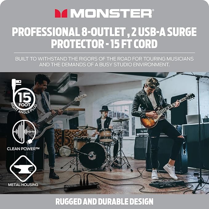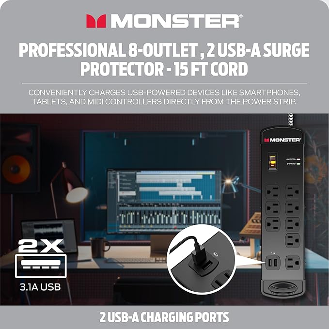 Monster Pro MI Professional Surge Protector Power Strip with Fireproof MOV Technology for Computers, Amplifiers, Pedal Boards, and Pro Audio Gear - 1960 Joule, 15 ft Cord, 8 Outlet, 2 USB