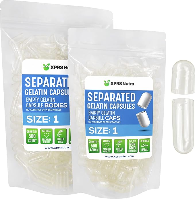 XPRS Nutra Size 1 Gelatin Separated Capsules - 500 Count Empty Pill Capsules Separated in Bags - Clear Empty Capsules - Separated Empty Capsules - Pill Capsules Empty for DIY Supplement Filling