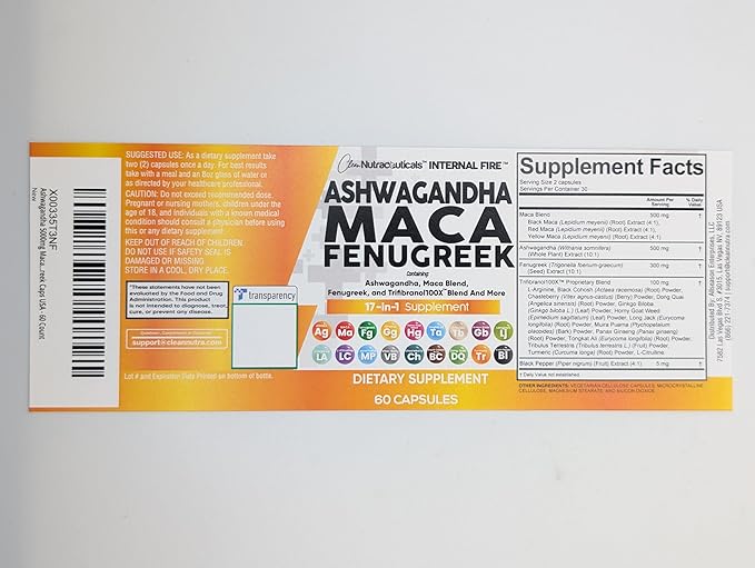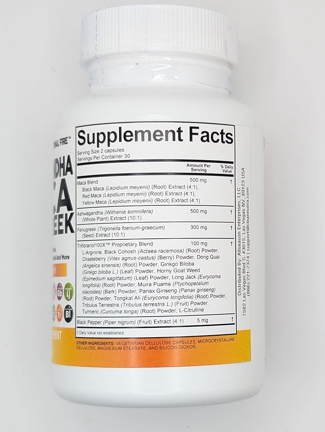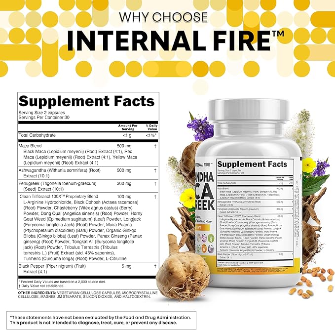 • The Ultimate Ashwagandha Extra Strength with Maca Root Capsules You've Been Looking For - Clean Nutra's Internal Fire provides 3 full-dose Herbal Supplements in one, containing a full Pure Maca Root, Fenugreek Capsules, and Ashwagandha Root in a convenient 2 capsule dosage. Finally, Red Maca Root Capsules for Women and Black Maca Root Capsules For Men have been combined into one solution that also contains a Fenugreek Supplement.