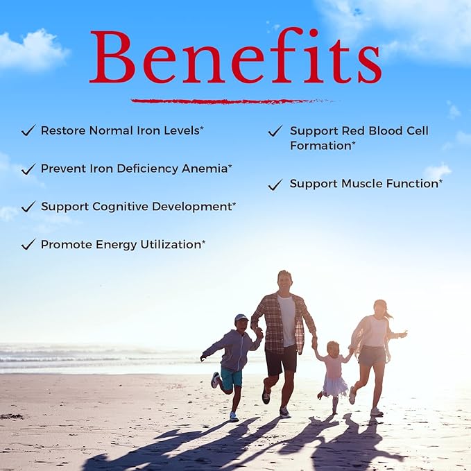 - Blood Building & Energizer*: Iron is an integral part of some proteins that are essential for many body functions.* Without enough iron, your body can’t make enough hemoglobin, a protein carrying oxygen from the lungs to all parts of the body, and myoglobin, a protein transporting oxygen to muscles.* When you keep normal iron levels and healthy red blood cell production, every cell in your body has sufficient oxygen to produce energy for everyday life without feelings of fatigue and dizziness.*