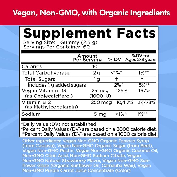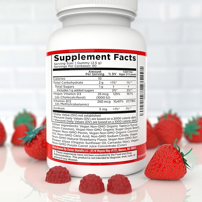 - ๐๐๐๐๐๐ฆ๐ง ๐ค๐จ๐๐๐๐ง๐ฌ ๐ข๐ฅ๐๐๐ก๐๐ & ๐ก๐๐ง๐จ๐ฅ๐๐ ๐๐ก๐๐ฅ๐๐๐๐๐ก๐ง๐ฆ: Vitamin D3+B12 Gummies by Dr. Danielle made with Vegan, Organic, Non-GMO, and Natural Strawberry Flavor. No Gelatin! Pectin Based, Dairy Free, Gluten Free, Wheat Free, Soy Free, Nightshade Free, Celiac Friendly. Made in a GMP Facility.