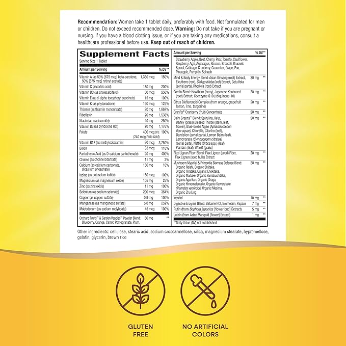- Nature’s Way Alive! Women’s 50+ Ultra Multivitamin supports heart health, brain function, bone health, immune health, eye health, and energy metabolism.*