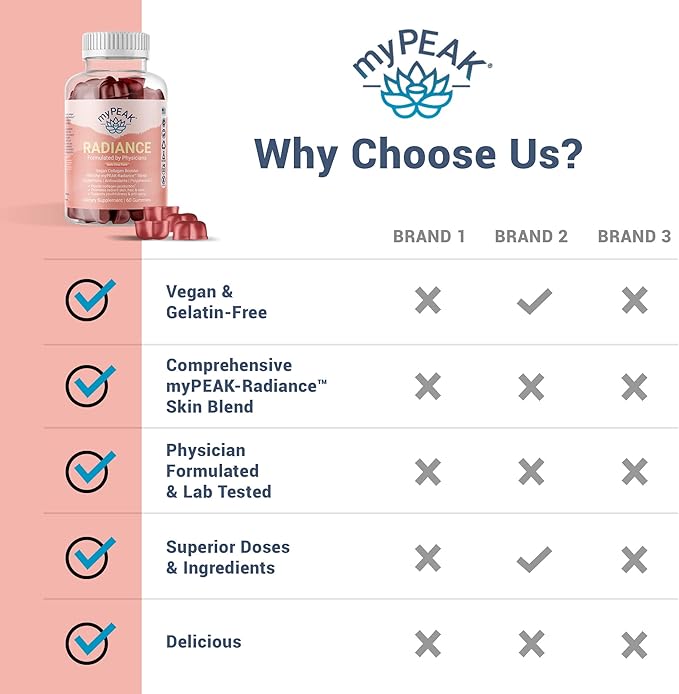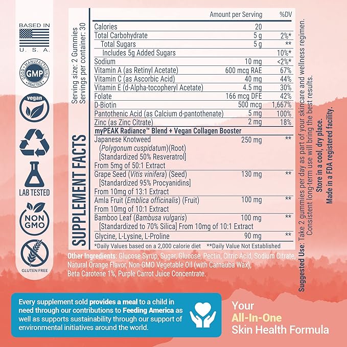 - Unleash Your Natural Radiance from Within - Radiance was made for you by physicians with your glowing skin, hair, and nail health in mind. Radiance combines comprehensive science-based, skin-health nourishing supplements and skin supporting vitamins into two delicious exotic citrus gummies a day. myPEAK Radiance vegan collagen supplement and collagen booster spotlights: Resveratrol, Grape Seed, Amla Fruit, Bamboo Leaf, Collagen Amino Acids, Biotin and Vitamins A-C-E + Zinc
