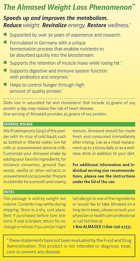- Optimizes Metabolism: Almased is specially formulated to optimize your metabolism, helping you burn calories more efficiently and achieve your weight loss goals faster.