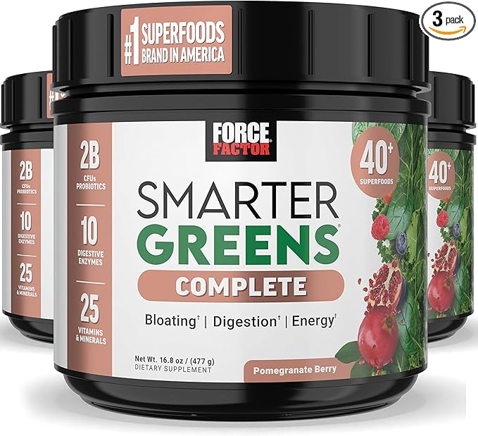 FORCE FACTOR Smarter Greens Superfoods + Digestion Powder, 3-Pack, Greens Powder with 2 Billion Probiotics, Digestive Enzymes, and Antioxidants to Detox, Cleanse, and Support Immunity, 90 Servings