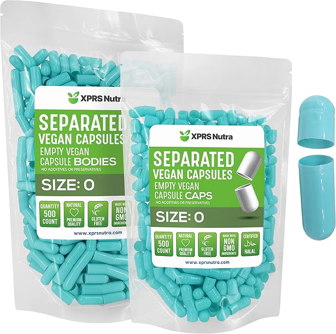 XPRS Nutra Vegan Size 0 Separated Capsules - 500 Count Premium Empty Capsules Separated in Bags - Separated Empty 0 Capsules - Pill Capsules Empty for DIY Supplement Filling (Aqua)