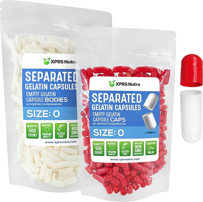 XPRS Nutra Gelatin Size 0 Separated Capsules - 500 Count Empty Capsules Separated in Bags - Size 0 Gelatin Capsules - Empty Gelatin Capsules for DIY Supplement Filling (Red/White)