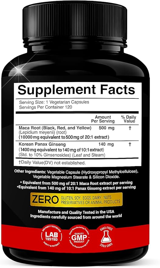 - MADE IN THE USA - To ensure only thehighest quality product all our productsare manufactured in a GMP-certifi ed non-GMO factory in the USA. We're proud tooff er research-backed supplementsformulated using only premiumingredients for maximum eff ectiveness;our Maca root plus Panax Ginsengcapsules for men and women is veganfriendly and contains No gluten, soy,eggs, dairy, nuts, or preservatives.