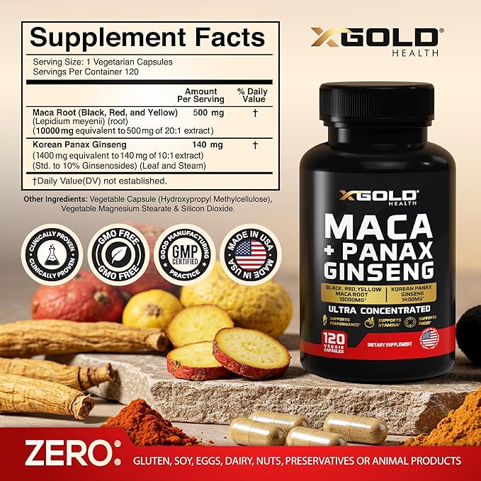 - POWER OF MACA + GINSENG EXTRACT IN ONE - The Highly Concentrated Form of X Gold Health Maca + Ginseng , a powerful blend of 10000mg Maca Root Pills (20X MORE STRENGTH) and 1400mg Korean Panax Ginseng (10X MORE STRENGTH), deliver a pure, potent dose than other best selling brands.
