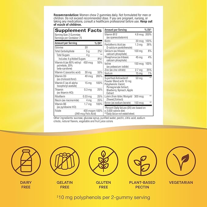 - Women chew 2 gummies daily. Delicious mixed berry flavored gummies make taking your vitamins fun.