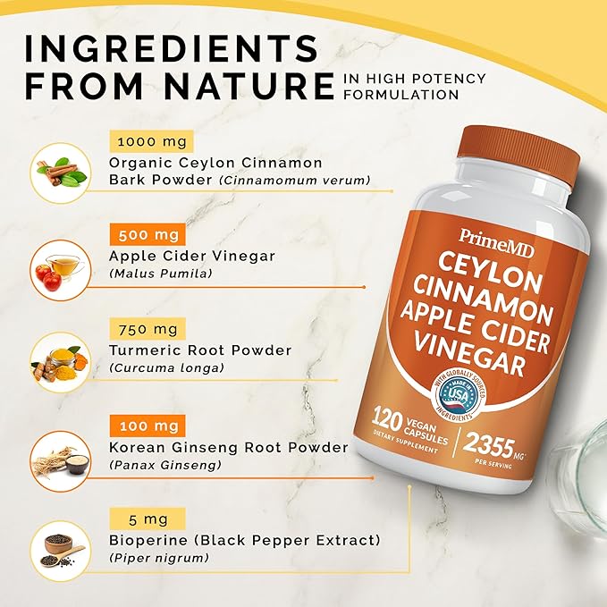 5-in-1 Ceylon Cinnamon Capsules 2355mg - Apple Cider Vinegar Capsules with Turmeric, Panax Ginseng, and Bioperine (120 Count, Pack of 2)
