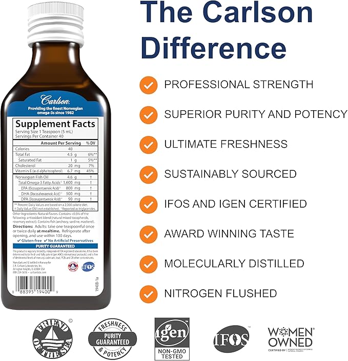 Carlson - The Very Finest Fish Oil, 1600 mg Omega-3s, Liquid Fish Oil Supplement, Norwegian Fish Oil, Wild-Caught, Sustainably Sourced Fish Oil Liquid, Just Peachie, 200 mL (6.7 Fl Oz)