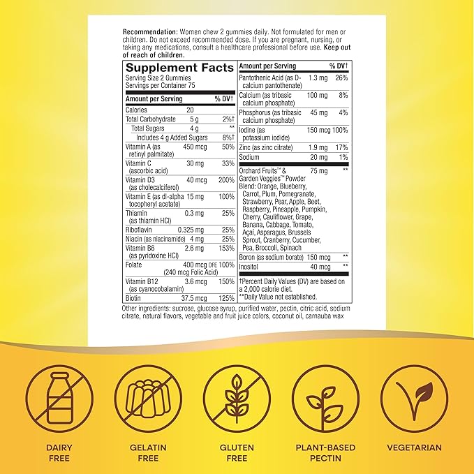 - Formulated with 16 vitamins and minerals for women’s wellness, including B-vitamins, vitamin A, vitamin C, vitamin D3, vitamin E, zinc and biotin, alongside food-based Orchard Fruits & Garden Veggies powder blend (75 mg per 2-gummy serving).*