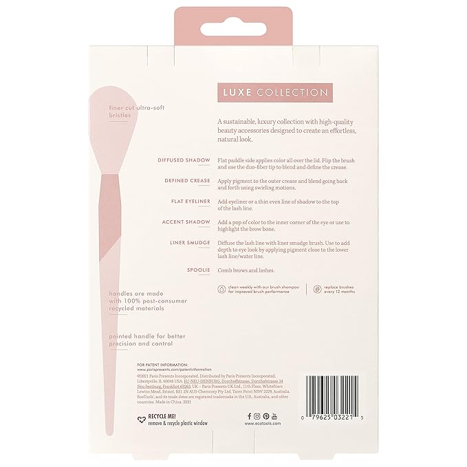 - EcoTools Luxe Luxurious Limited Edition Exquisite Eye Makeup Brush Set includes (1) diffused shadow eye brush, (1) defined crease brush, (1) flat eyeliner brush, (1) accent shadow brush, (1) liner smudge brush, and (1) spoolie brush for the ultimate eye kit