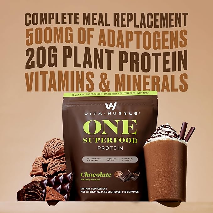 VitaHustle ONE Superfood Protein All-in-One Nutrition Shake, 20g Chocolate Plant Protein, 86 Superfoods, Vitamins, & Minerals, Ashwagandha, Adaptogens, Meal Replacement, 15 Servings