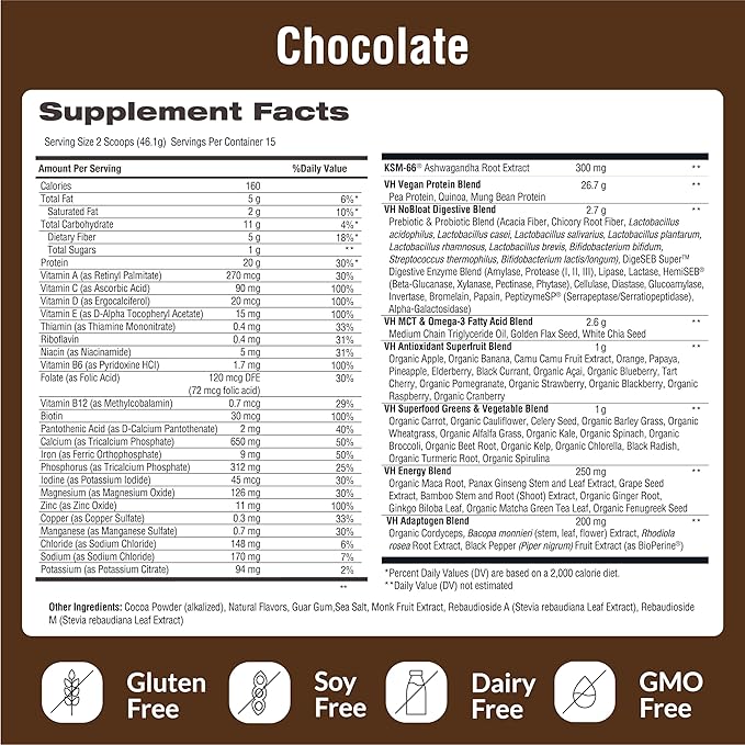 - MORE THAN A MEAL REPLACEMENT – An all-in-one vegan protein powder loaded with omega-3s, MCT, pre + probiotic fiber, adaptogens, digestive enzymes, electrolytes, functional mushrooms, clnically proven with 300 mg of KSM-66 ashwagandha, and more.