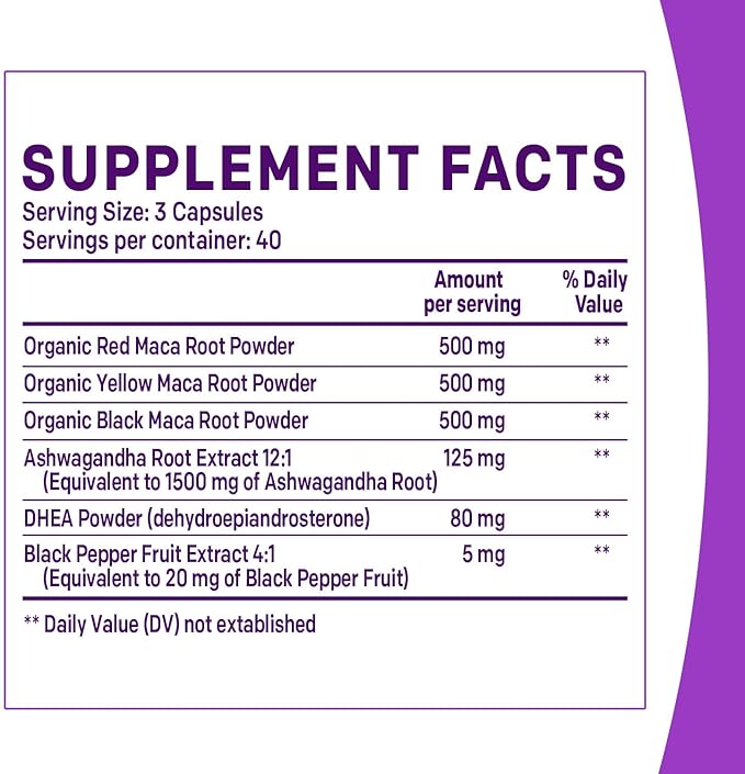 - Nutritional Powerhouse Maca Capsules - A natural blend of all yellow, red, and black maca root powders with Ashwagandha root, DHEA powder, and Black pepper fruit for sustained energy.