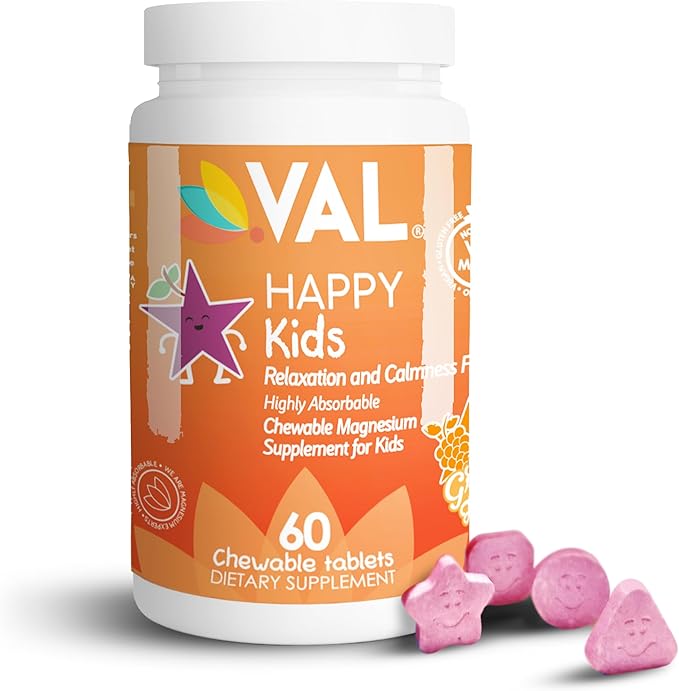 VAL Chewable Magnesium for Kids, Relaxation and Calm Formula, Glycinate, Citrate, Taurate, Vitamin B6, D, C, Natural Star Grape Flavor, Sugar Free, Gluten Free, Non-GMO, 60 Chewable Tablets