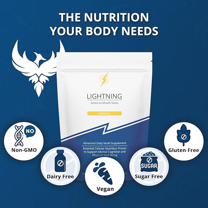 - 36 Micronutrient Vitamins and Minerals: Meet the super-charged powder multivitamin for men and women. It's powered by 36 essential vitamins, amino acids, and plant extracts engineered to help rebalance, rev up, and support your cognitive function without caffeine and other stimulants. Powered by our Direct-to-Cell technology, Lightning can access the bloodstream and brain to make a big impact for its size.
