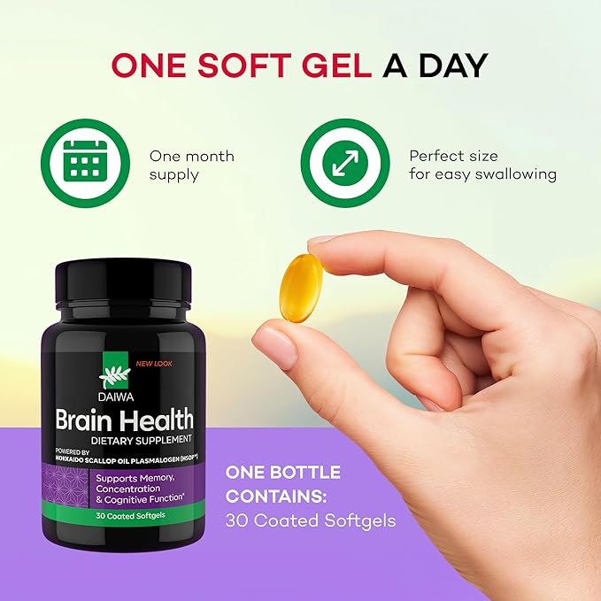 Daiwa Brain Health Supplement for Adults - Plasmalogen Focus Supplement for Memory and Concentration - Cognitive Brain Booster with 50mg of Hokkaido Scallop Oil Plasmalogen (HSOP) - 30/ct