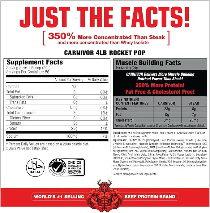MuscleMeds CARNIVOR Beef Protein Isolate Powder, Muscle Building, Recovery, Lactose Free, Sugar Free, Fat, Free, 23g Protein, Rocket Pop, 56 Servings
