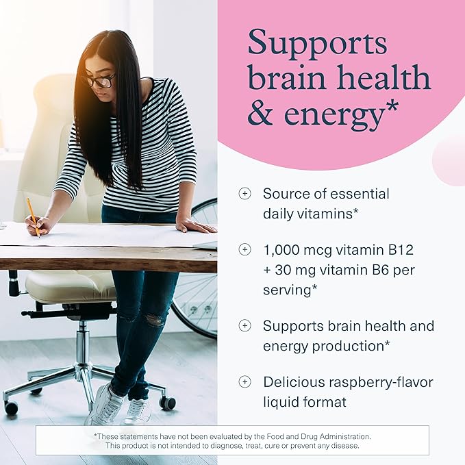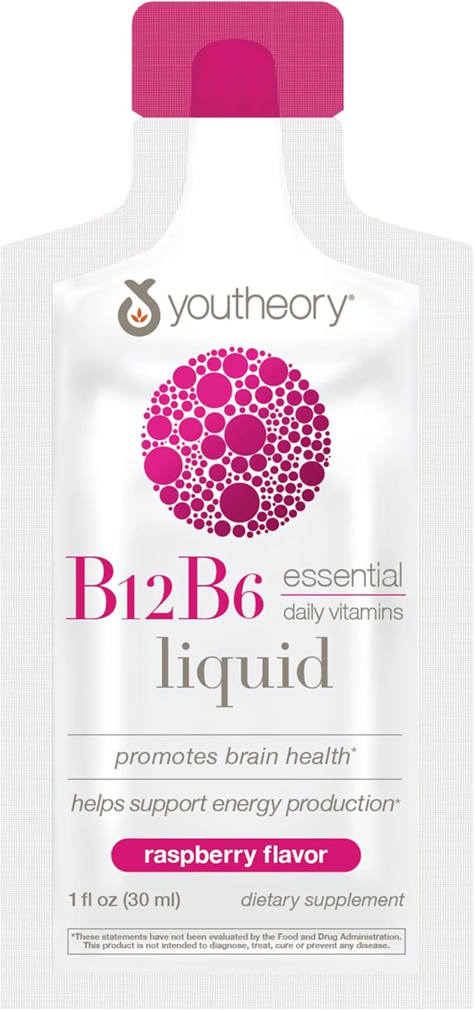 Youtheory Vitamin B12 B6, Daily Energy and Brain Support Supplement, Liquid Raspberry Flavor, 12 – 1oz Single Serving Packets