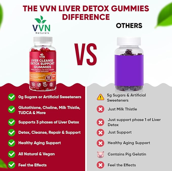 - FATTY LIVER REPAIR: VVNaturals liver detox supplements feature a complete blend of liver cleanse detox & repair fatty liver. Formulated to specifically target fatty liver concerns, these gummies aid in repairing liver damage caused by various factors, promoting overall liver function and well-being.