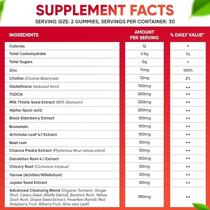 - DETOX: These fatty liver supplements gummies feature a comprehensive blend of ingredients that aid in all three phases of liver detoxification. With 700mg of Silymarin Flavonoids, Alpha-lipoic Acid, Dandelion, and Artichoke to support phase 1, 700mg of L-Glutathione for phase 2, and 500mg of TUDCA for phase 3, alongside an additional cleansing blend to facilitate the detox process.