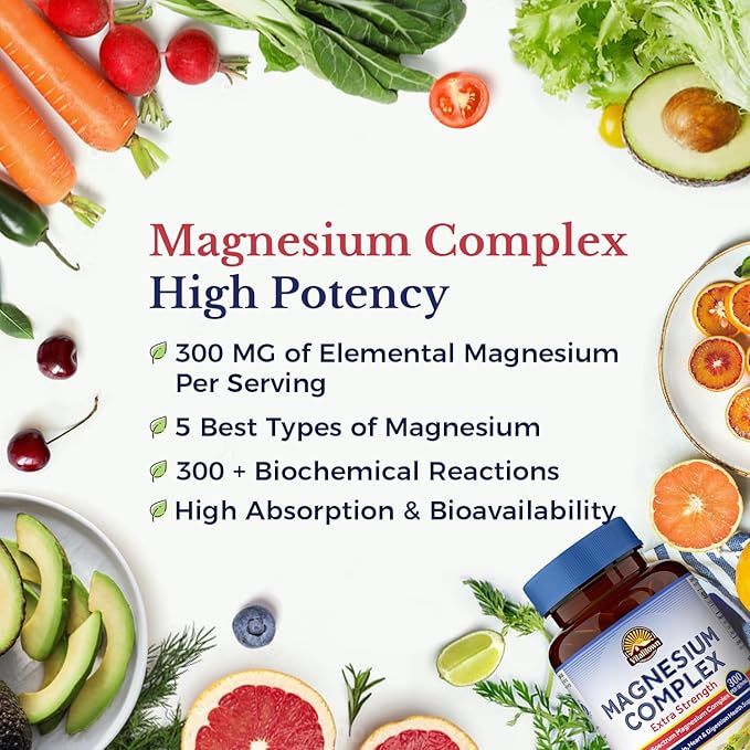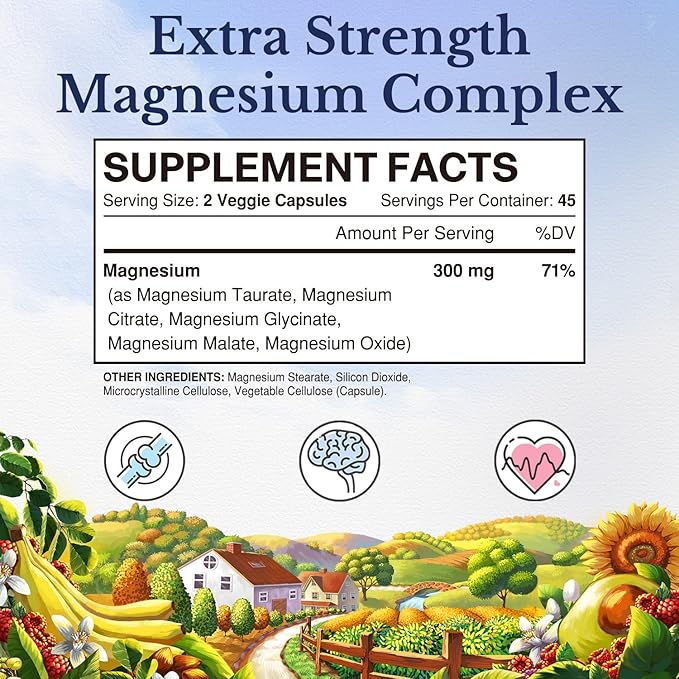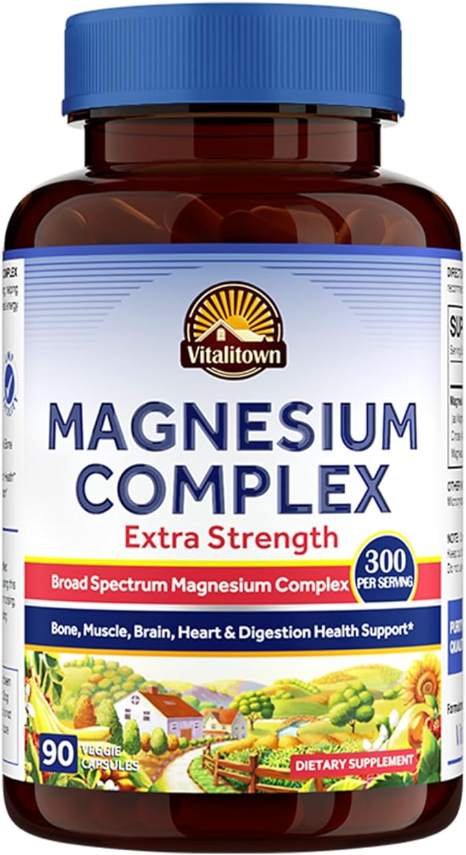 - 300 MG Extra Strength Magnesium Supplement: Vitalitown Magnesium Complex contains 300 mg of elemental magnesium from five of the most beneficial forms.* Broad spectrum chelated magnesium delivered in easy-to-swallow vegetarian capsules to support energy production and metabolism, improving exercise recovery, and maintaining healthy brain and heart function.*