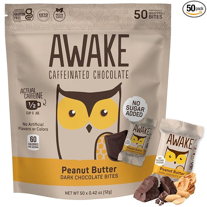 AWAKE - Caffeinated Chocolate Bites - Peanut Butter Dark Chocolate (No Sugar Added), 50 Bites - 50mg Caffeine - Energy Bites - Coffee Alternative - Fairtrade, Gluten Free, Non GMO - 0.48oz