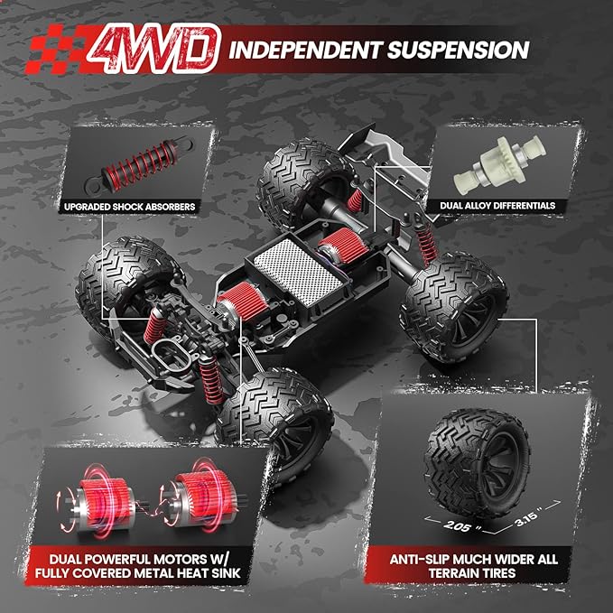 • 【Dual Powerful Motor For Super Speed】: Dual built-in motors provide great horse power, giving you 40+ KM/H high speed racing thrill. Powerful motor also provide this rc monster truck climbing ability. It can climb on 50-degree slopes effortlessly.