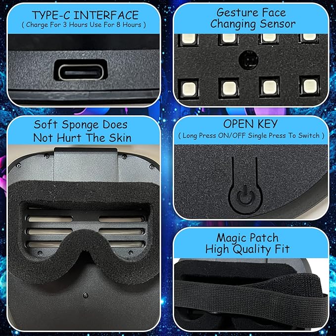 - [Fun and Technology Mask]: Led Mask uses high light 234 lamp beads and 3535 RGB LED lamp beads. First uses need charging time for 3-4 hours (Ps: USB TYPE-C CHARGING: 5V/1A), About 8-10 Hours with full time running.