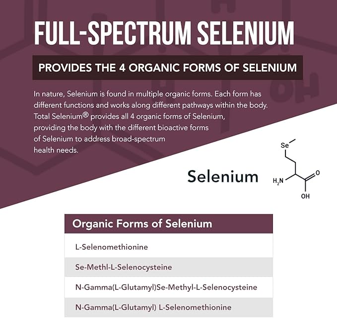 - Full-Spectrum Selenium, Contains 4 Organic Forms: Total Selenium provides all 4 organic forms of Selenium, including Selenomethionine; this provides the body the different bioactive forms of Selenium in order to address broad spectrum health needs. Each form has different functions and works along different pathways within the body.