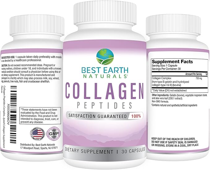 Best Earth Naturals Hydrolyzed Collagen Type I & III - Collagen Peptides Supplement for Women and Men to Support Hair, Skin, Nails, & Joints 30 Day Supply (30 Capsules)