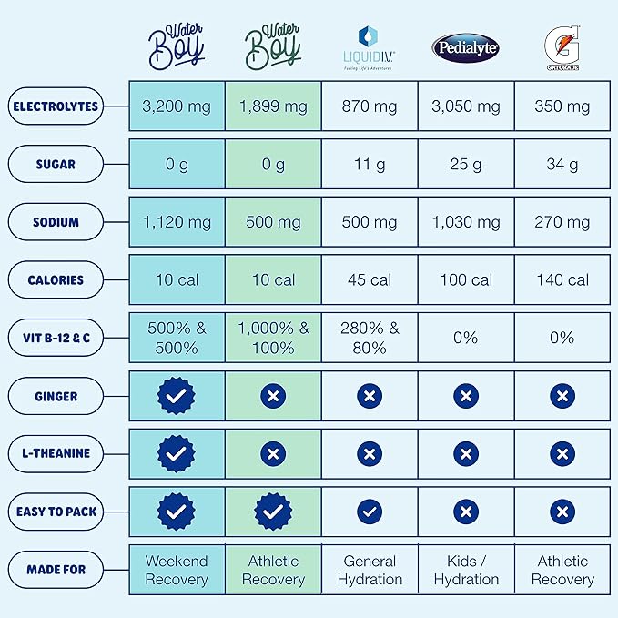 - MADE FOR ADULTS: Most electrolyte mixes and electrolyte drinks on the market are made for kids, general hydration or sports or and are LOADED with sugar. Waterboy weekend recovery is made specifically to help adults. Waterboy includes L-theanine, ginger and vitamins to help you bounce back faster